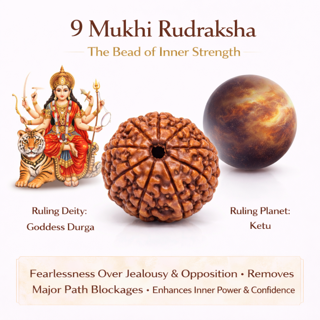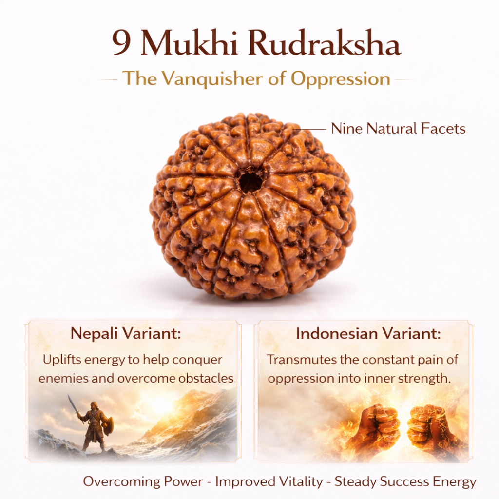 Authentic 9 Mukhi Indonesian Rudraksha bead, lightweight and durable. Supports confidence, stability, emotional strength, and steady progress. Only at Amogh Tantra.