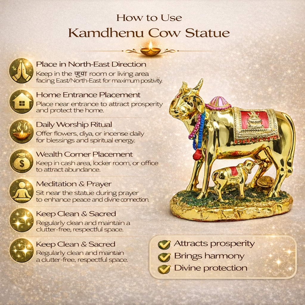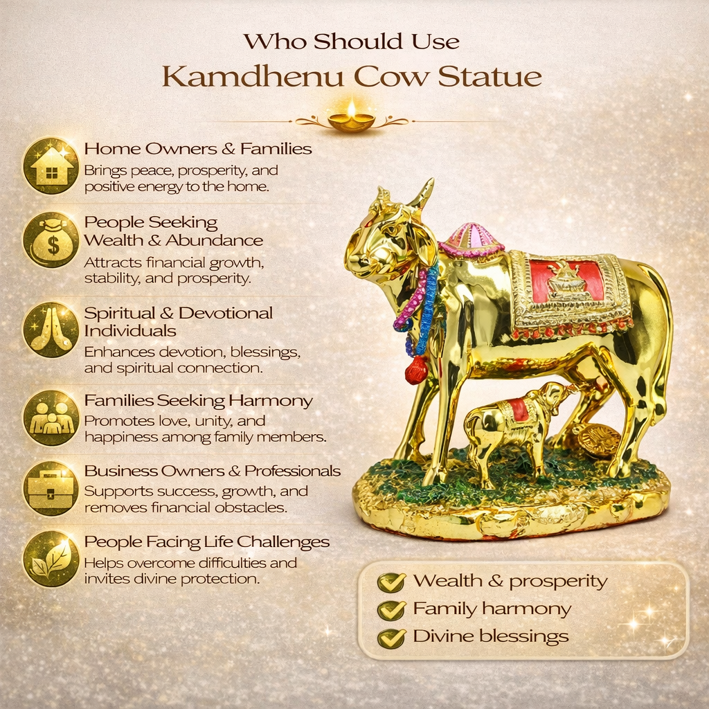 Kamdhenu is considered a symbol of wealth, nourishment, and positivity. Many people keep this statue at home or in their office to attract success, harmony, and good fortune. It is often placed in prayer areas for daily worship or used as a decor item that carries spiritual meaning.