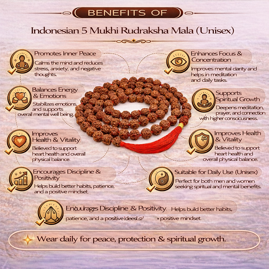 Buy Indonesian 5 Mukhi Rudraksha Mala for men and women. Made with natural beads, lightweight and perfect for daily wear, meditation, and a calm, balanced life.
