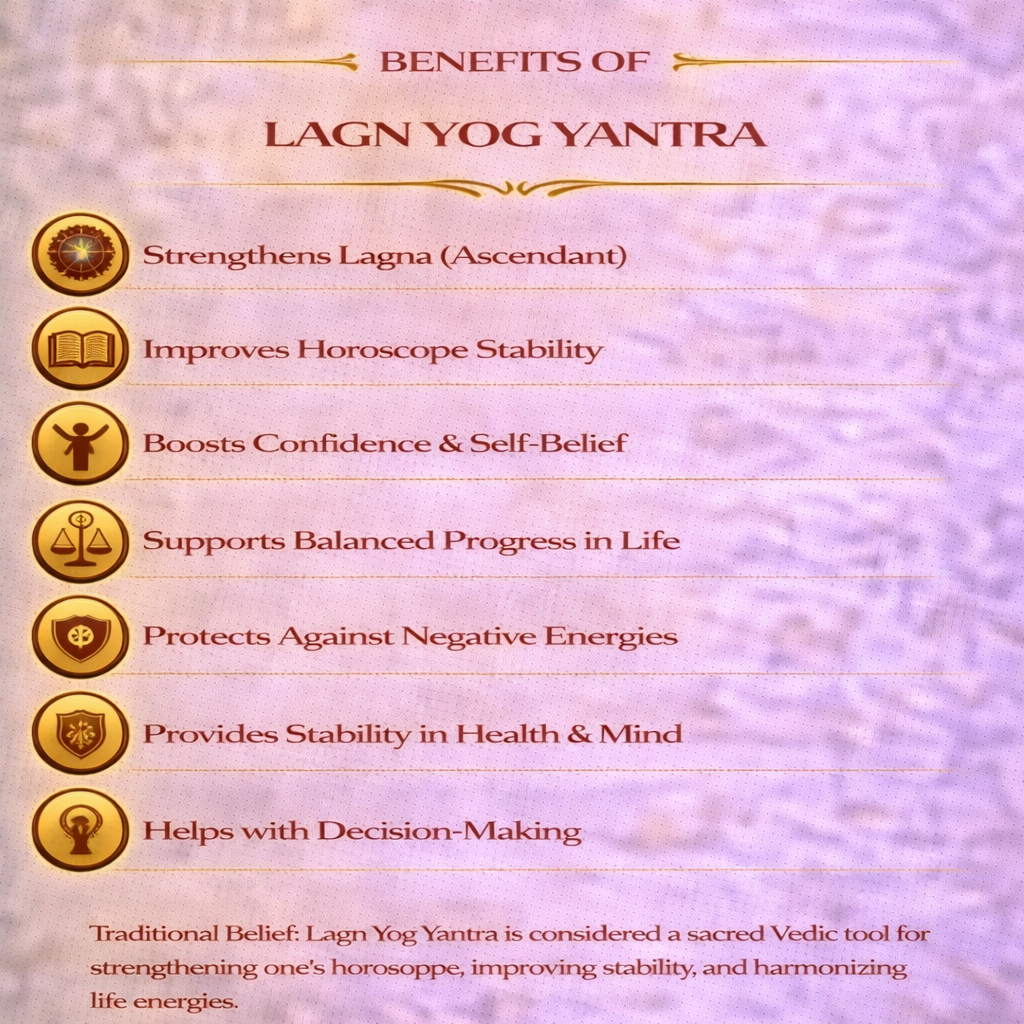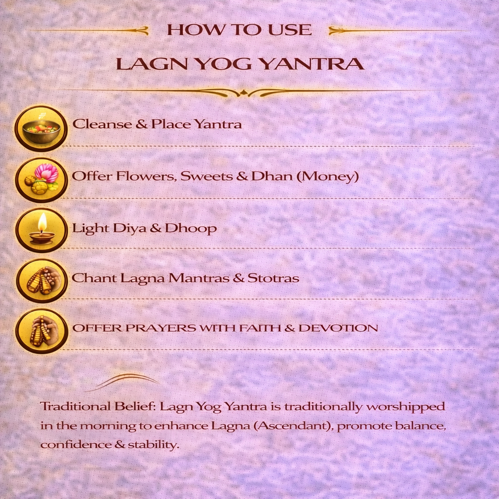 By incorporating Lagn Yog Yantra into daily spiritual practice, one may experience improved confidence, emotional balance, clarity of purpose, protection, and smoother life progress. When used with faith and positive intention, this yantra supports overall well-being, stability, and harmony, helping the devotee move forward with strength and assurance in life.