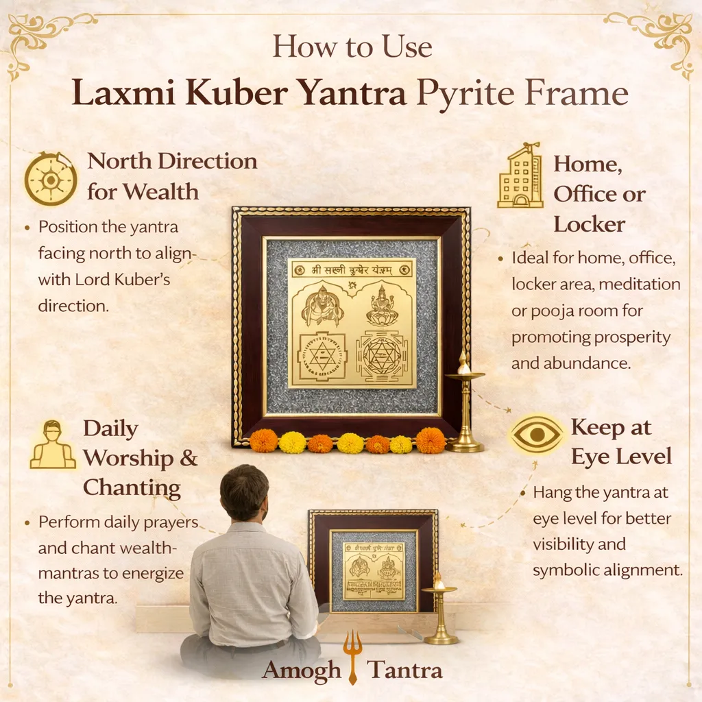 The Laxmi Kuber Yantra Pyrite Frame is ideal for homes, offices, shops, business establishments, lockers, and pooja rooms. According to Vastu principles, placing the yantra in the north direction (associated with Lord Kuber) or northeast direction (associated with divine energy flow) enhances financial growth and positive vibrations. It can also be kept near cash counters, safes, or work desks to symbolically activate wealth energy.