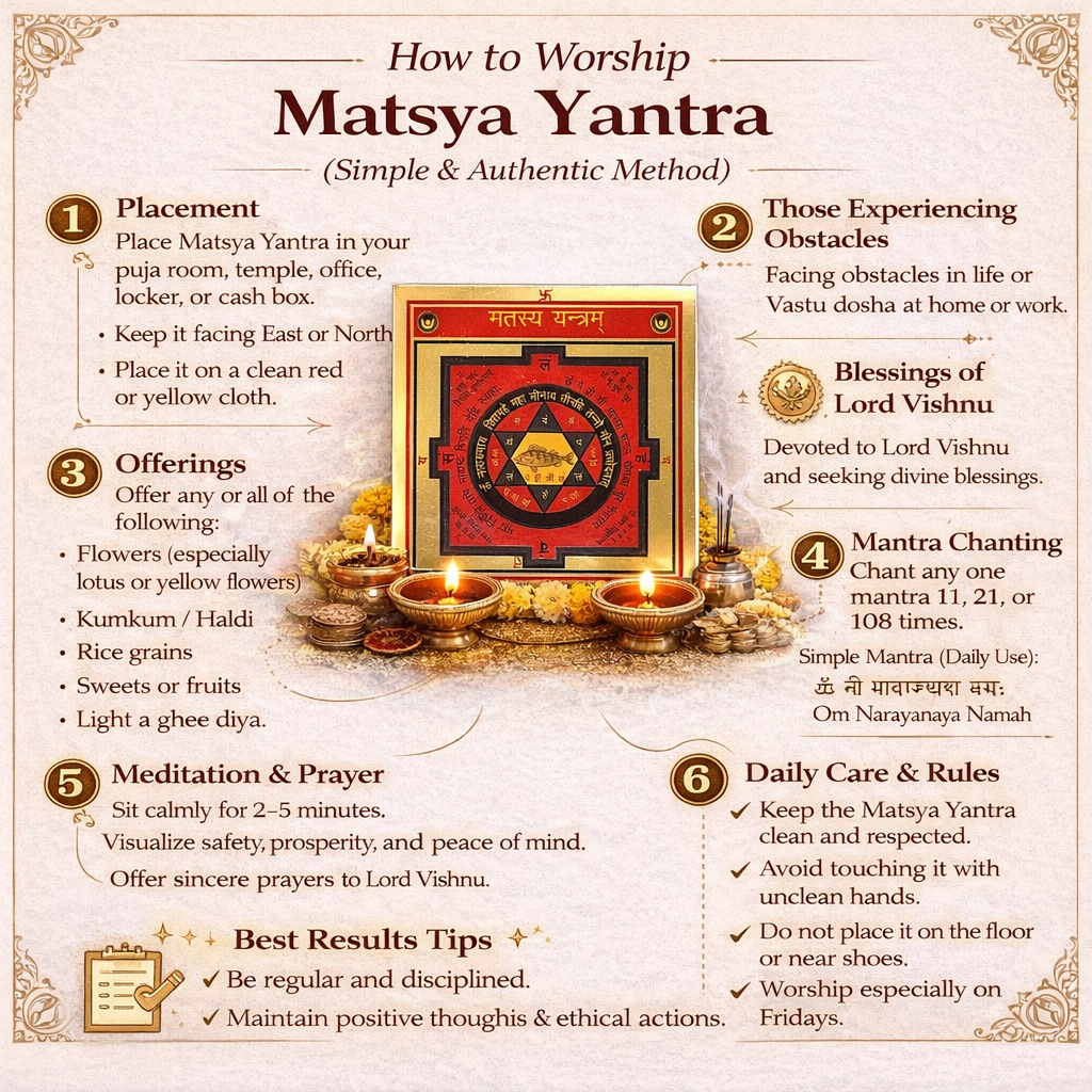 Shree Matsya Yantram is suitable for placement in the puja room, home, office, shop, or workplace. It helps maintain balance, supports decision-making, and encourages a sense of safety and confidence. Regular worship strengthens faith and aligns the devotee with divine protection and preservation energy.