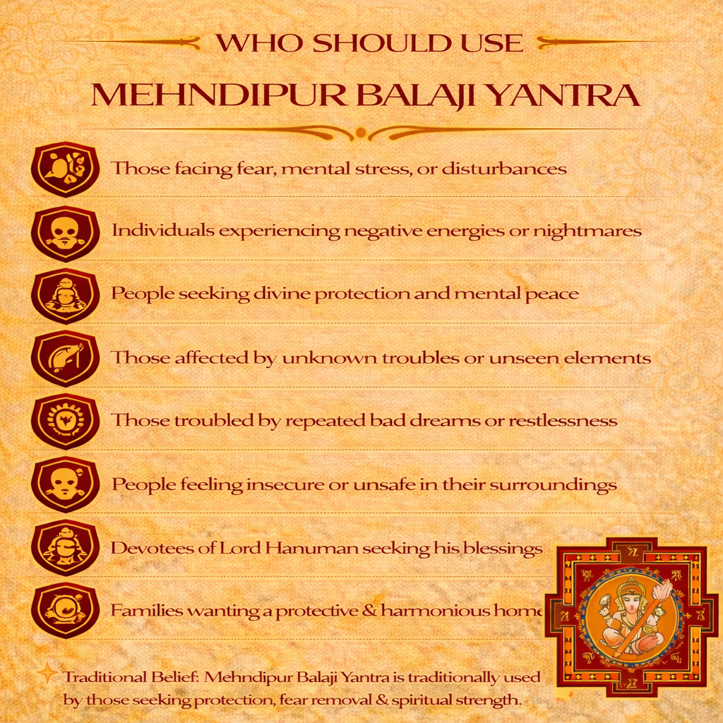 This yantra is especially beneficial for individuals experiencing fear, restlessness, repeated bad dreams, mental stress, unexplained disturbances, or a sense of negativity in their surroundings. It is also widely used by devotees seeking divine protection, emotional strength, and spiritual stability during challenging phases of life.