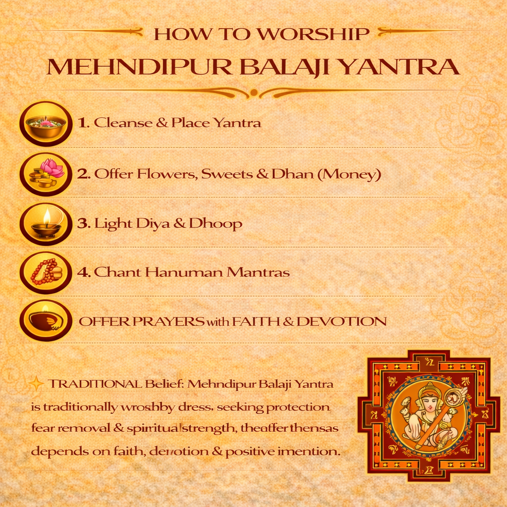 Mehndipur Balaji Yantra is a powerful and protective spiritual yantra inspired by the divine energy of Shri Balaji (Lord Hanuman), revered at the holy shrine of Mehndipur in Rajasthan. This sacred yantra is traditionally worshipped for protection from negative energies, fear, mental disturbances, and unseen influences, while promoting courage, peace, and inner stability.