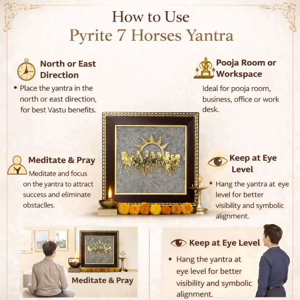 According to Vastu guidelines, placing the 7 Horses Yantra in the south direction enhances fame and recognition, while placement in the north direction supports financial growth and new opportunities. It is ideal for offices, cabins, reception areas, workspaces, living rooms, and business establishments. Keeping it at eye level ensures better visibility and symbolic activation of its energy.