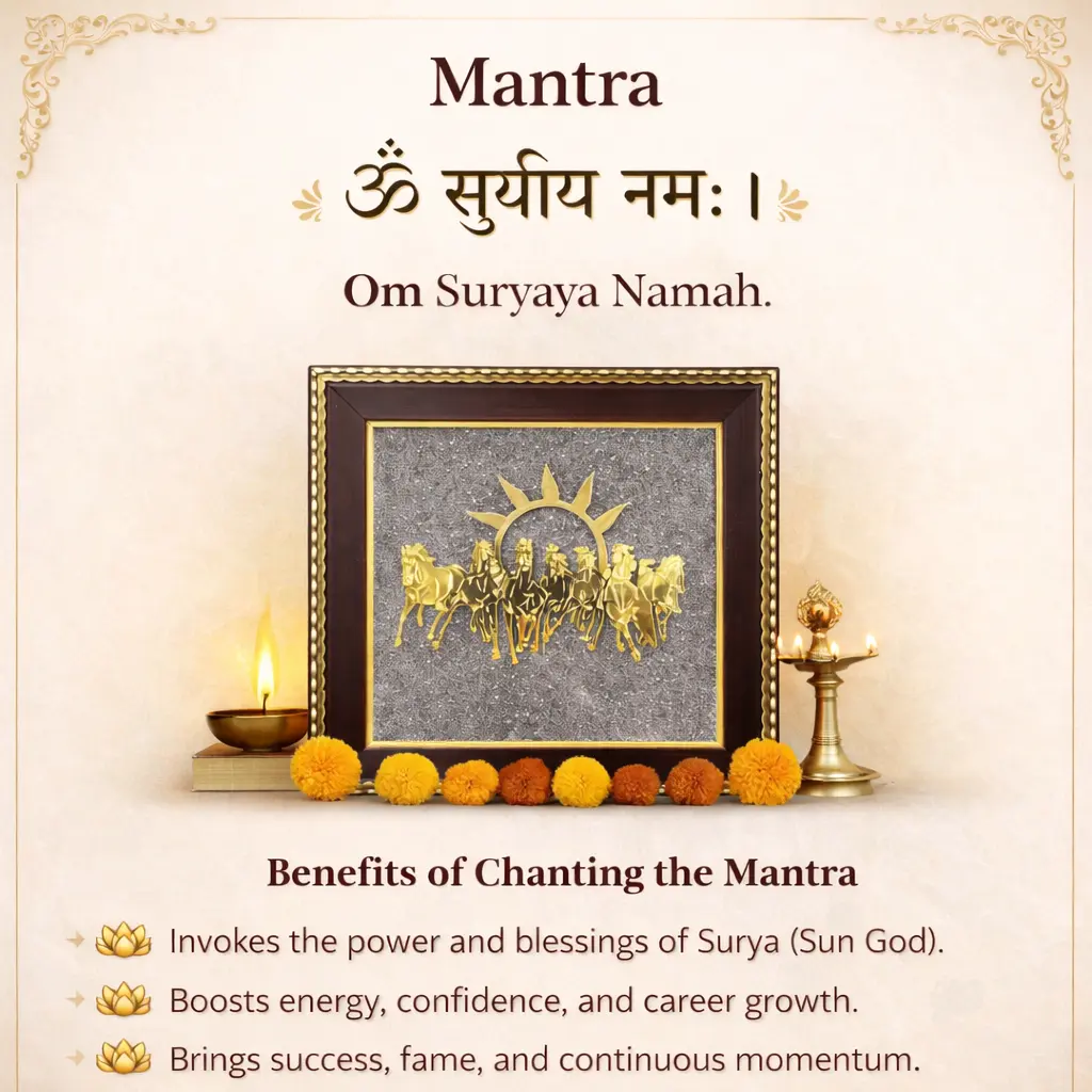 This yantra also makes a meaningful gift for housewarming ceremonies, business inaugurations, corporate events, festive occasions like Diwali, and milestone celebrations. Gifting the 7 Horses Yantra symbolizes wishes for success, prosperity, growth, and achievement.