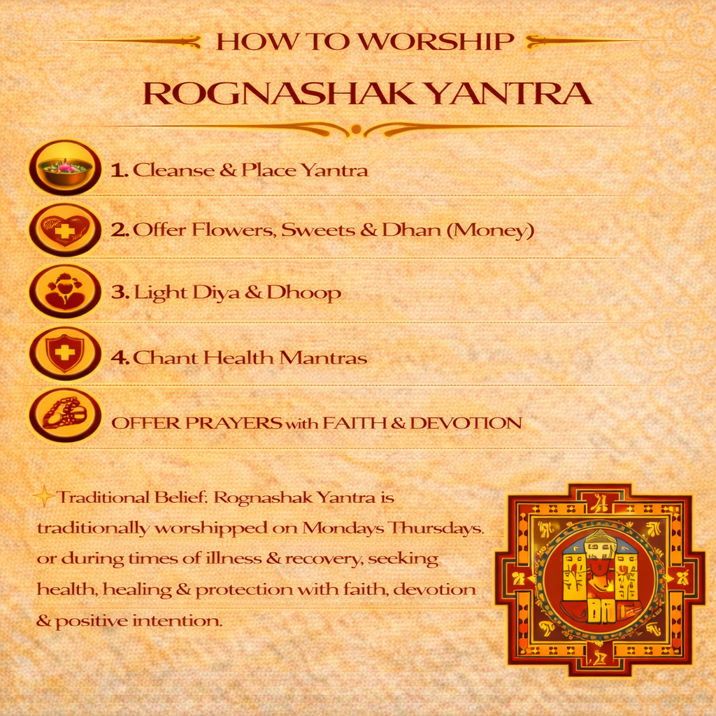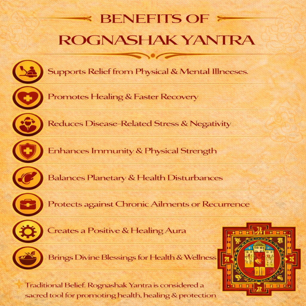 By incorporating Rognashak Yantra into daily spiritual practice, devotees may experience improved strength, peace of mind, faster recovery, and protection from negative health influences. When used with devotion, medical care, and positive thinking, it supports a balanced, healthier, and more harmonious life.