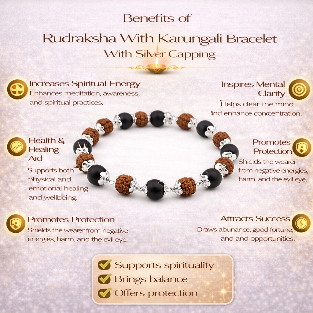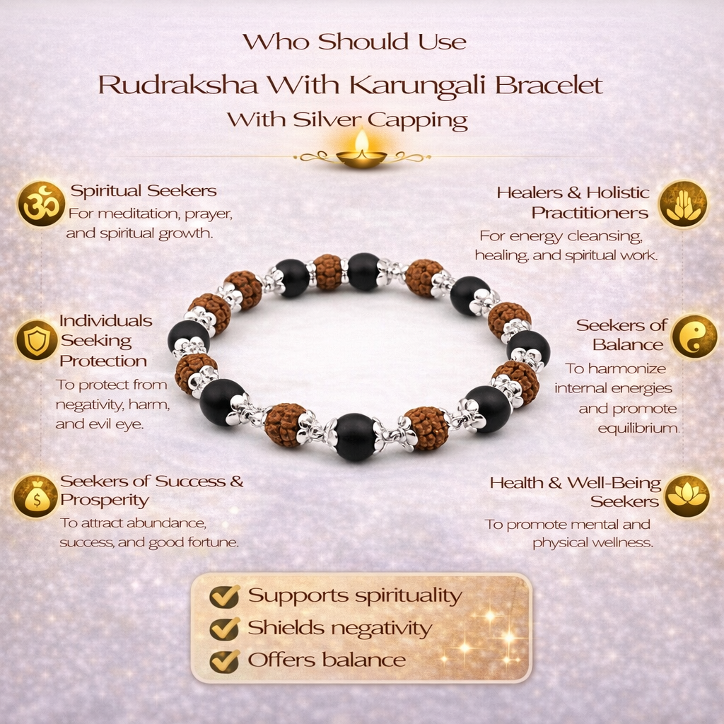From an SEO perspective, this bracelet stands out as a highly searched spiritual accessory, combining keywords like “Rudraksha bracelet,” “Karungali bracelet,” and “silver capped spiritual jewelry.” Its unique combination of materials and benefits makes it appealing to customers looking for both style and spiritual significance.