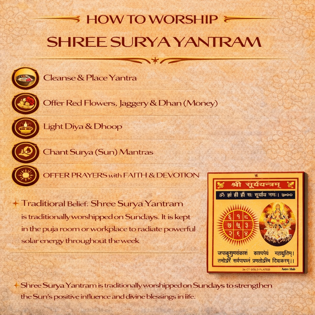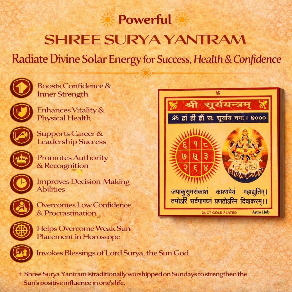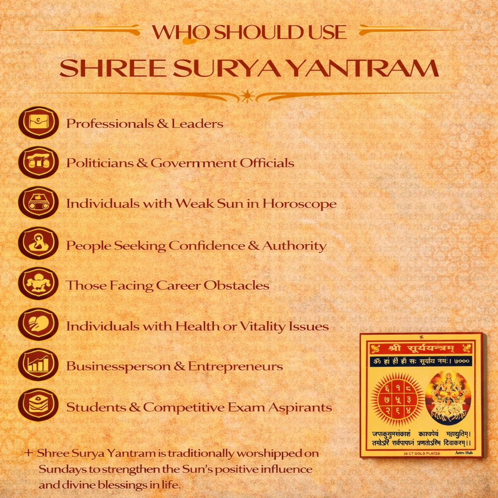 Shree Surya Yantram is also known to help overcome fear, hesitation, low confidence, and health-related issues linked to vitality and immunity. It creates a positive aura in the surroundings and attracts respect, recognition, and authority. Students, professionals, business owners, and those seeking growth and stability can benefit greatly from this yantra.