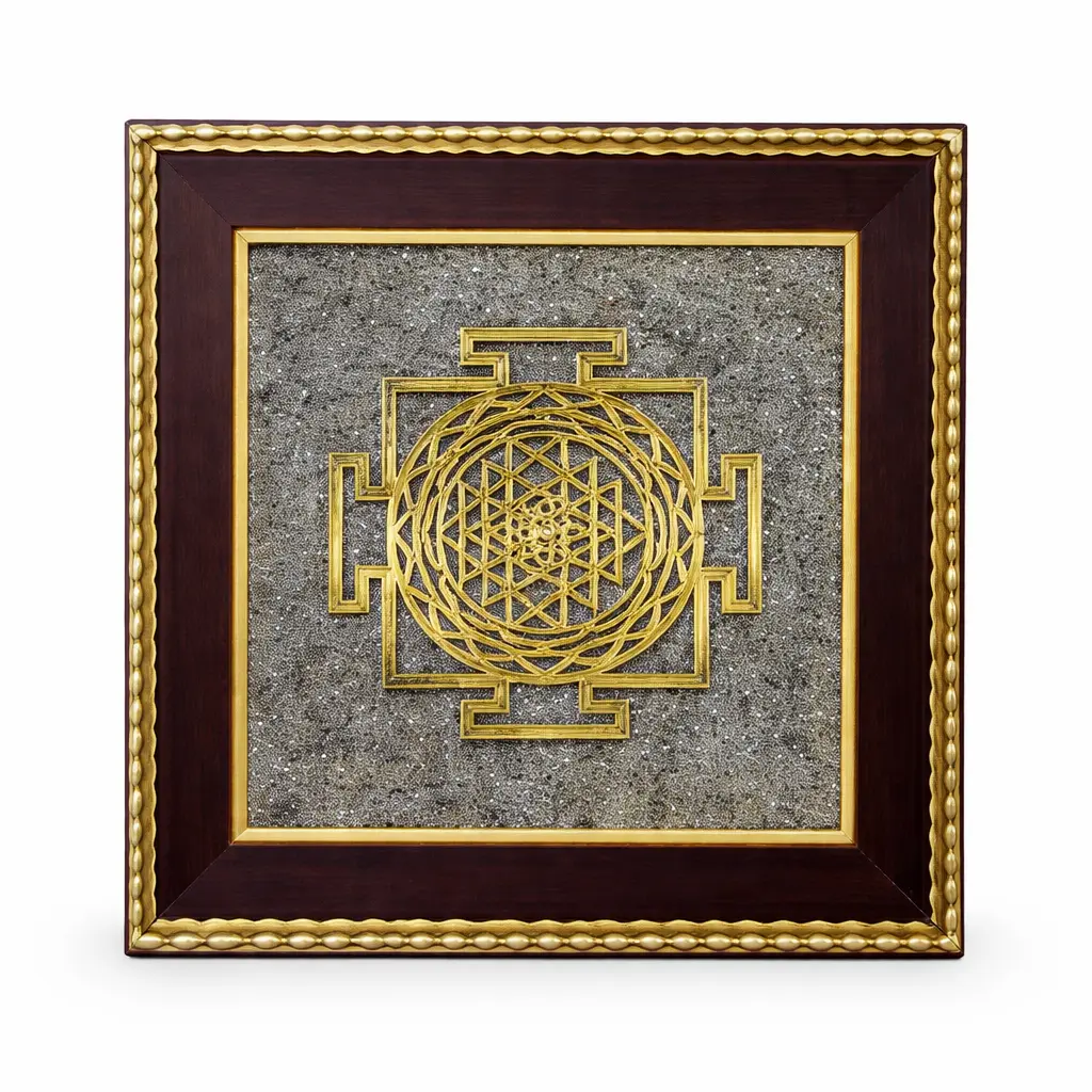 This beautifully crafted Shree Yantra is precisely engraved on a premium golden metallic plate, designed according to traditional sacred geometry principles. The intricate interlocking triangles symbolize the union of divine masculine and feminine energies, creating a powerful field of abundance and universal balance. The yantra is placed within a stunning pyrite-finished background and encased in a premium wooden frame with elegant golden detailing, making it both a spiritual tool and a luxurious décor piece.