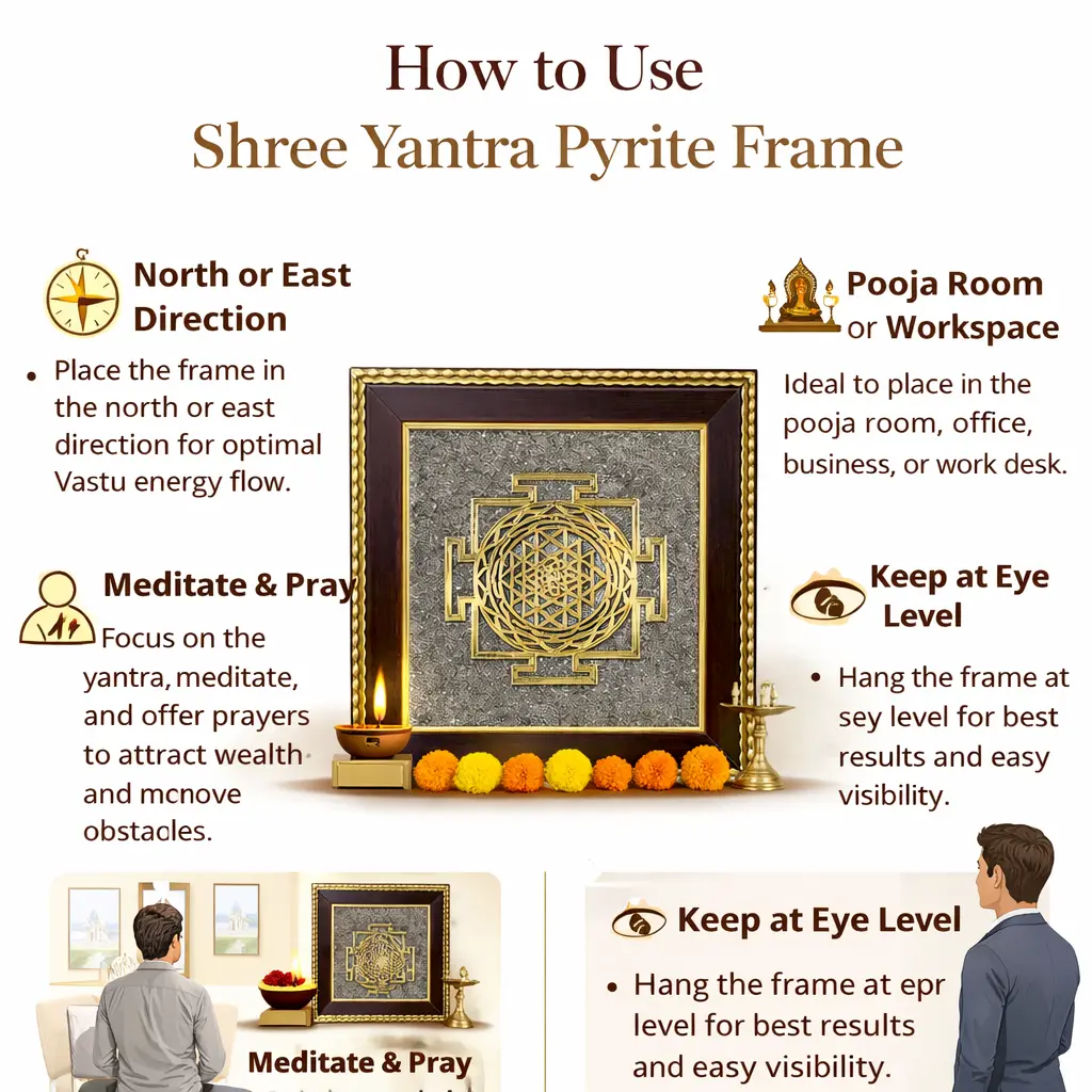 The Shree Yantra Pyrite Frame is ideal for homes, offices, shops, reception areas, pooja rooms, meditation spaces, and business establishments. According to Vastu principles, placing the Shree Yantra in the north, east, or northeast direction enhances wealth energy and ensures a steady flow of opportunities. It is especially beneficial for entrepreneurs, business owners, professionals, and individuals seeking growth, stability, and financial progress.
