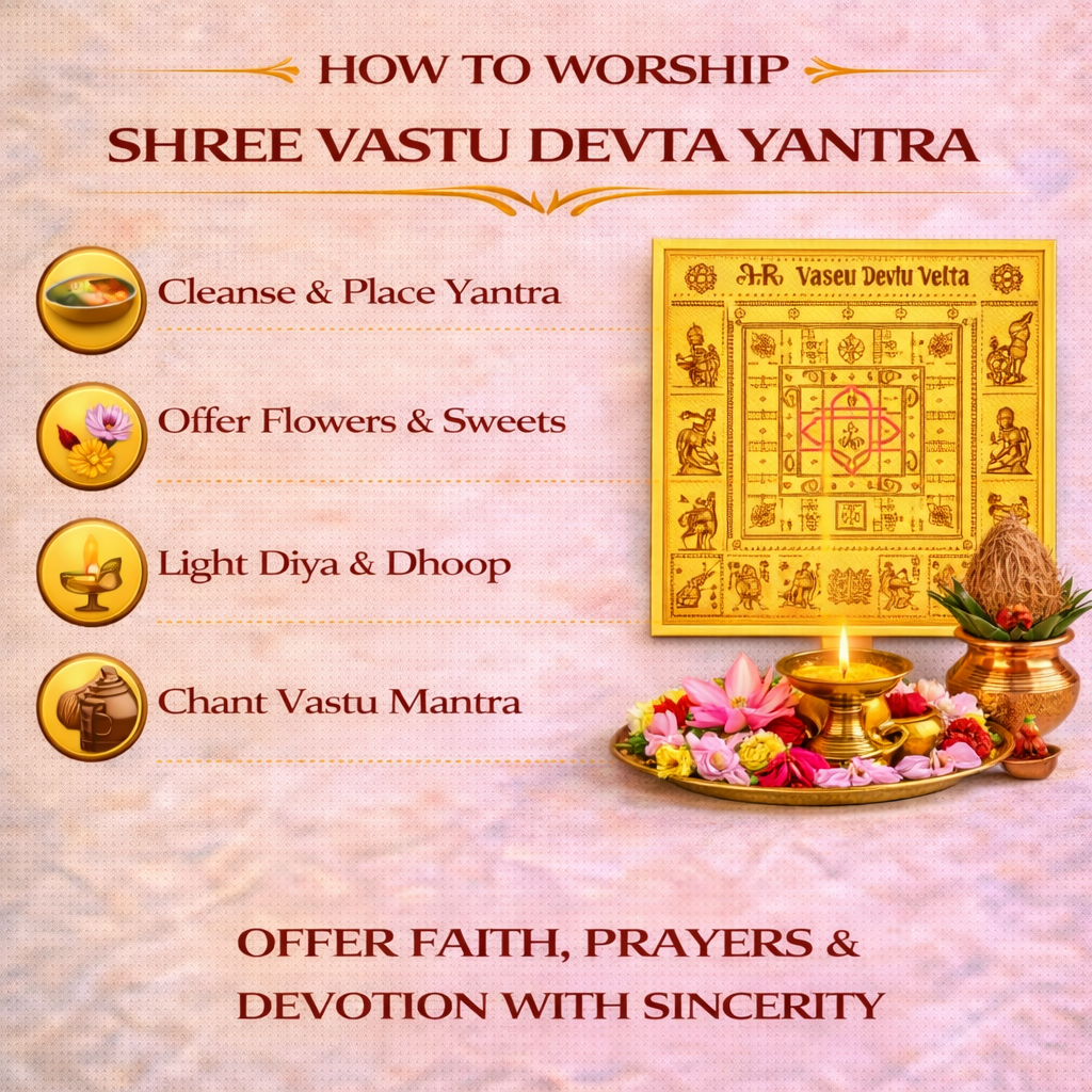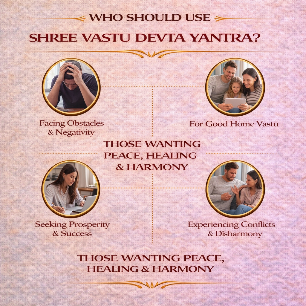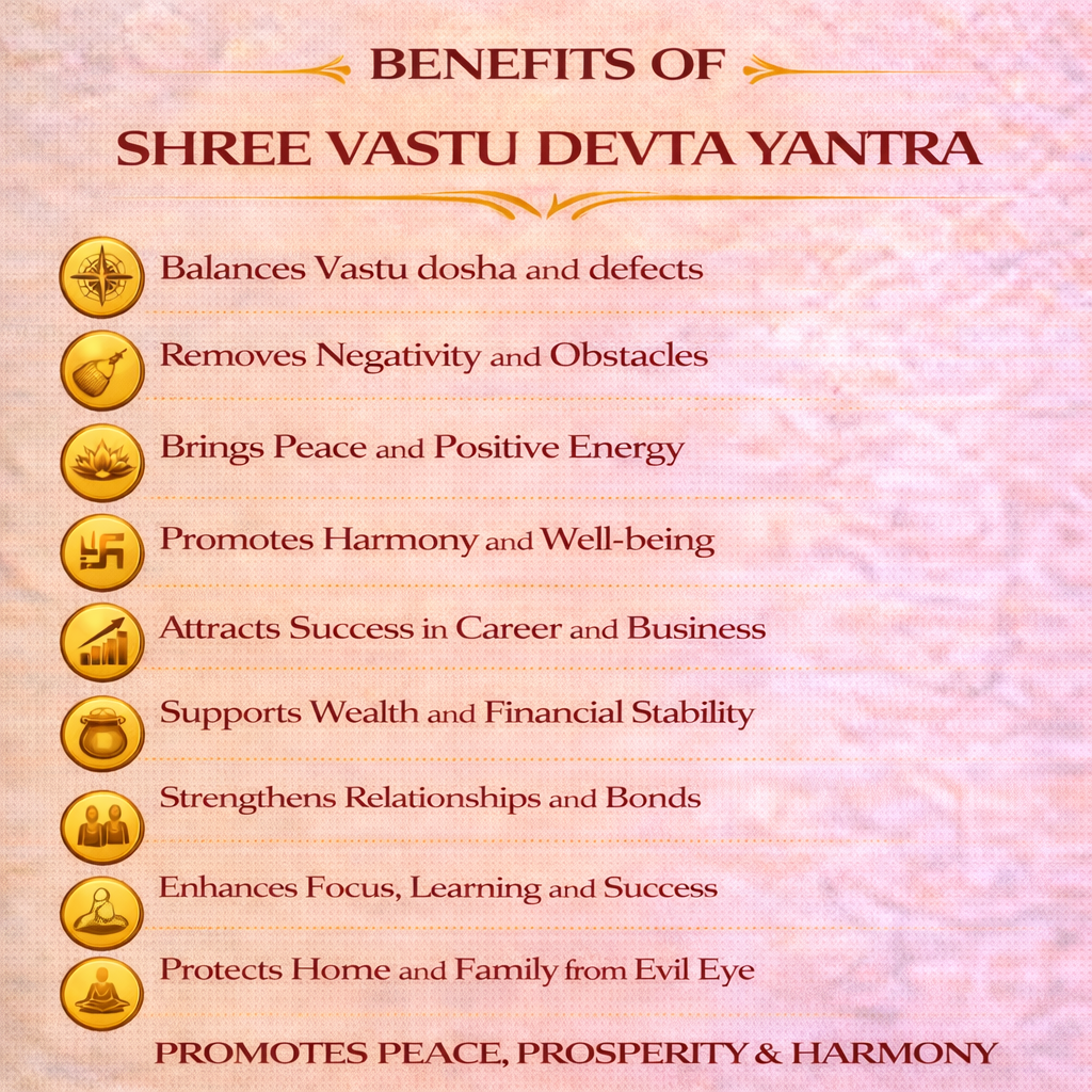 According to Vedic principles, imbalance in Vastu can lead to stress, financial loss, health issues, relationship problems, and lack of peace. Shree Vastu Devta Yantra is designed using sacred geometric patterns and mantras that help restore positive energy flow and stabilize the environment. When installed and worshipped with faith, it is believed to reduce the effects of Vastu dosha without the need for structural changes.